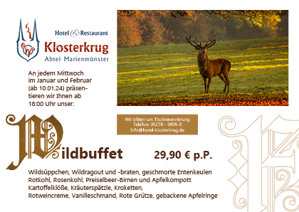 An jedem Mittwoch im Januar und Februar laden wir Sie ab 18 Uhr zu unserem Wildbuffet im Klosterkrug ein.